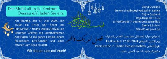 Das Multikulturelle Zentrum Dessau e.V. öffnete am 17. Juni 2024 seine Türen und seinen Garten für ein fröhliches und buntes Annäherungsfest (Opferfest). Zahlreiche Familien und Kinder aus verschiedenen Ländern und Kulturen kamen zusammen, um gemeinsam dieses wichtige islamische Fest zu feiern.
